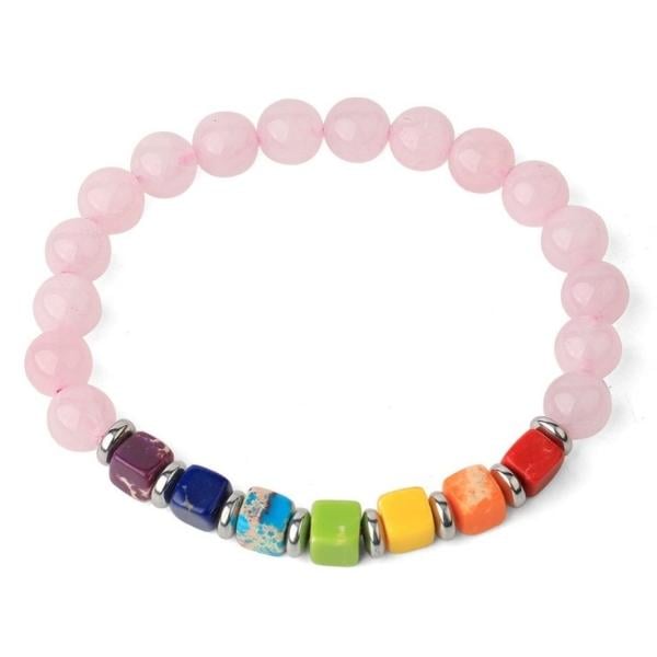 Questo gioiello spirituale riunisce un mix di perline rotonde e quadrate, tutte legate alla litoterapia. Le prime sono dedicate al minerale dell’amore, il quarzo rosa, e le seconde ai 7 chakra. Utilizzato nel Reiki o nello yoga, questo bracciale è un talismano protettivo nella vita quotidiana. Le sue proprietà litoterapiche sono rivolte a chi fatica a trovare il sonno, ma anche a chi ha problemi di pelle o di guarigione.