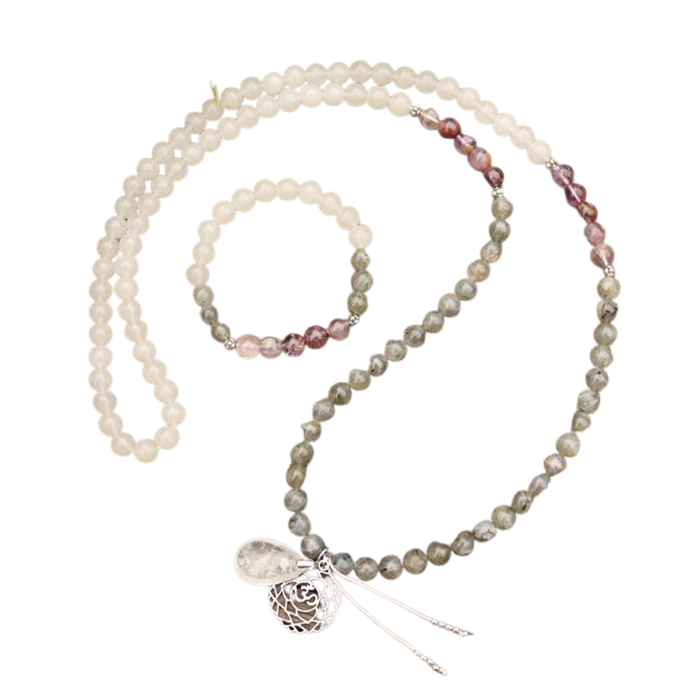 Collana + Bracciale in Pietra Naturale 8mm: Labradorite, Ametista, Quarzo Chiaro, Ciondolo in Cristallo di Quarzo Chiaro