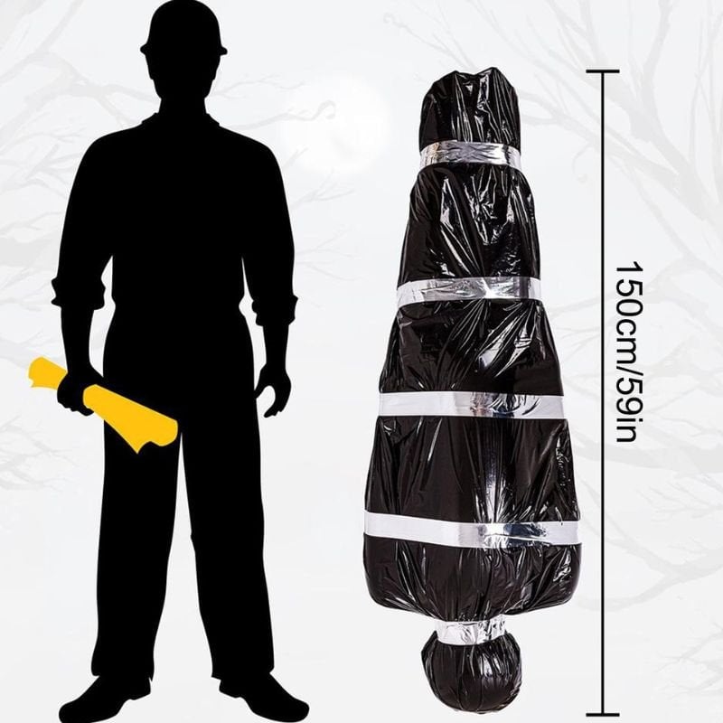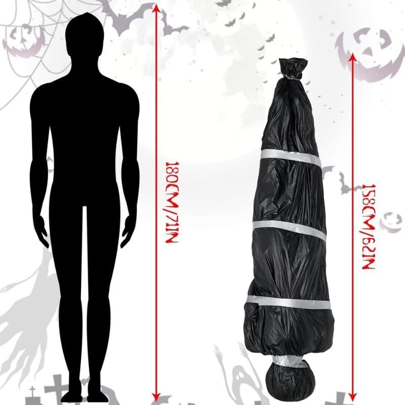 Facile da installare: gonfia il rivestimento del manichino con una pompa d’aria (non inclusa) per dargli una forma umana normale, poi mettilo in un sacco nero per creare un aspetto di “cadavere terrificante”. Lega poi il sacco con del filo di ferro e appendilo dove desideri decorare.