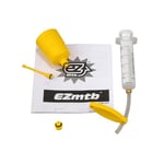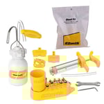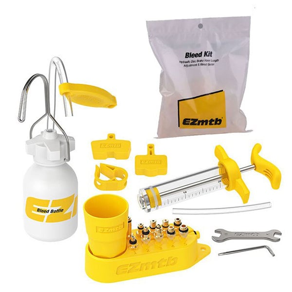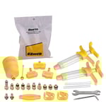 Questo kitcontiene tutti gli strumenti necessari per spurgare con successo il freno idraulico e garantirne il corretto funzionamento. Questo include, ad esempio, un imbuto e due siringhe per rimuovere le bolle d’aria e versare il liquido pulito.